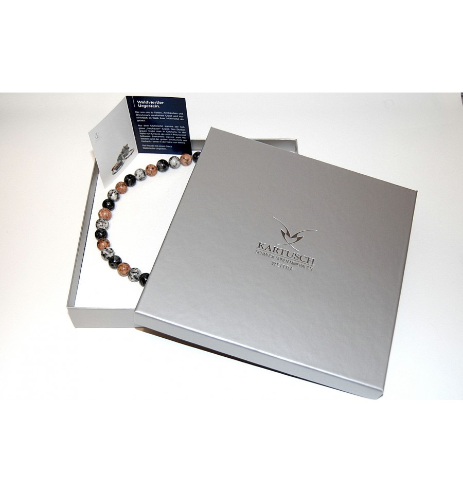 Geliefert wird die Kette in einer hochwertigen Geschenkverpackung mit einer kurzen Erklärung über die verschiedenen Granitarten und Vorkommen.