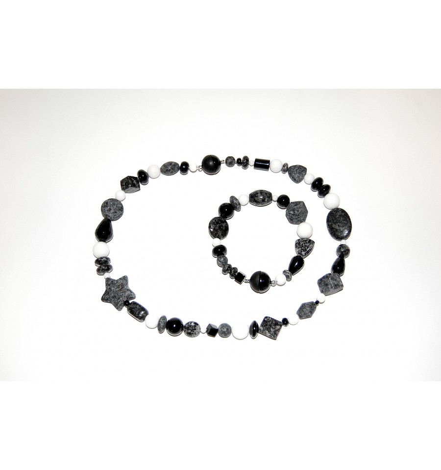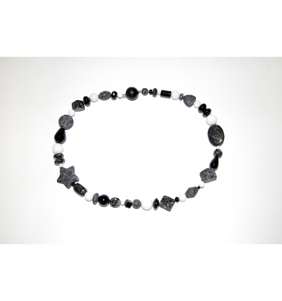 Asymetrische matte Granitkette mit verschiedenen Schliffformen aus Waldviertler Granit. Zwischen den Granitteilen befinden sich verschiedene Teile aus Onyxund weißer Jade.