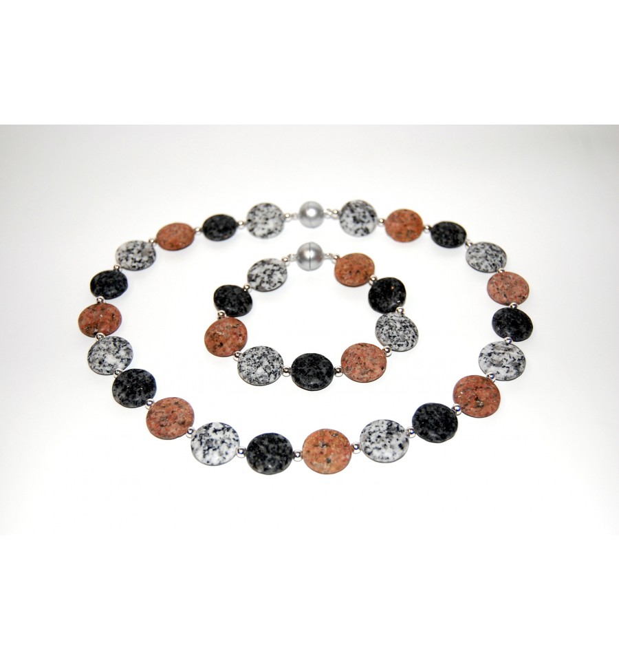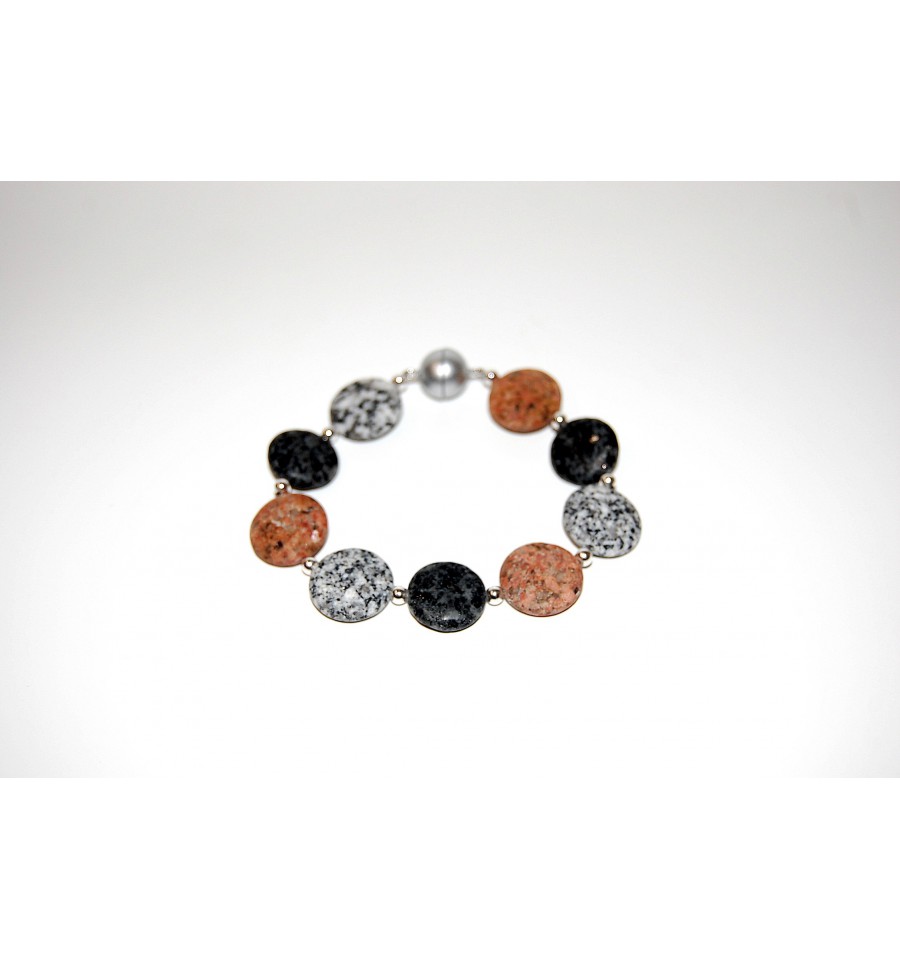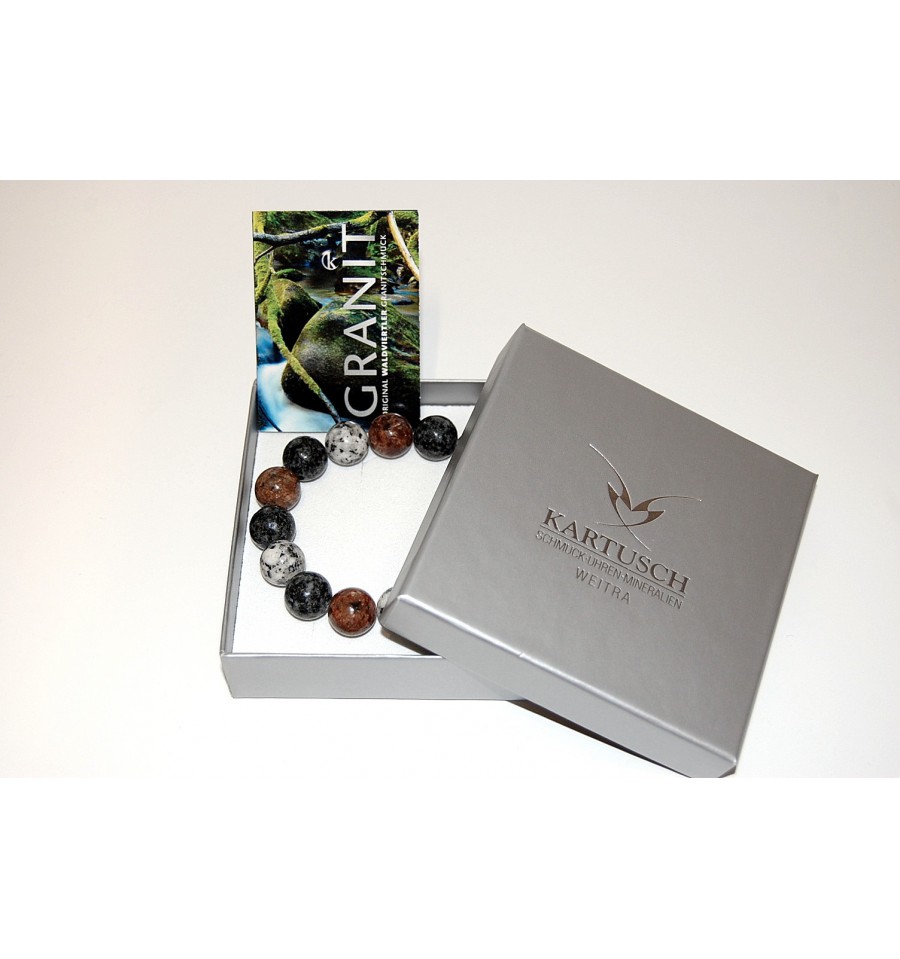 Dreifärbiges Granitarmband aus Waldviertler und Mühlviertler Granit bestehend aus flachen matten Linsen mit 18 mm Durchmesser. Zwischen den Granitteilen befinden sich 4mm Silberkugeln. Das Armband ist auf einem nylonummantelten Stahldraht gefädelt und mit einer farblich dazupassenden Kunststoffmagnetschließe versehen. Die Länge beträgt ca. 19cm. Geliefert wird das Armband in einer hochwertigen Geschenkverpackung mit einer kurzen Information über die verschiedenen Granitarten und Vorkommen.